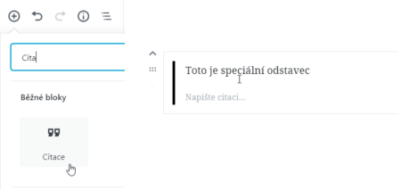 V blokovém editoru můžete citaci vložit jako samostatný blok. Nicméně uvnitř něj už nebudete moci vkládat například nadpisy. Postupujte takto: