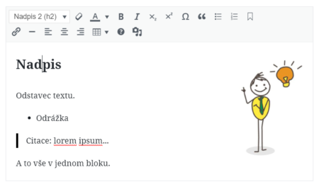 Blok můžete kdykoliv ukončit a vložit za něj například blok Obrázek. Ten se hodí v případě, kdy chcete mít blok s obrázkem přes celou šířku obsahu. Jinak můžete obrázky vkládat přímo v rámci bloku Klasický editor.