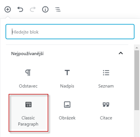 Kombinací vhodných rozšíření lze dosáhnout hybridního režimu editoru. Vkládat tak můžete nejenom bloky, ale jako blok můžete vložit Klasický editor, tedy klasický odstavcový blok. V něm můžete tvořit nadpisy, odstavce, odrážky, obrázky a další prvky v rámci jednoho bloku.