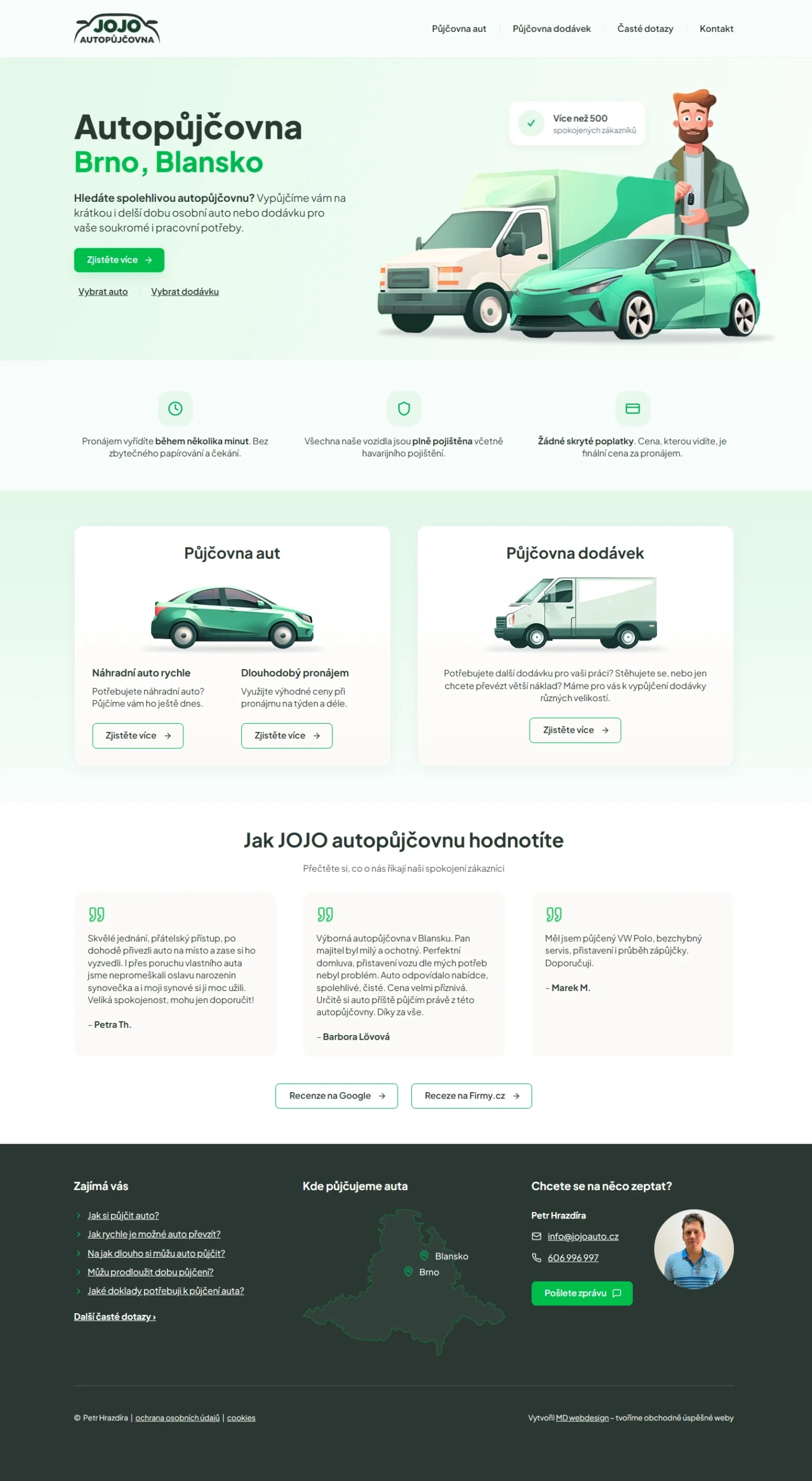 Web půjčovny aut a dodávek v Brně a Blansku Klient: Petr Hrazdíra Realizace: design, kódování, responzivní design, redakční systém, kalendáře rezervací, copywriting Jazykové mutace: čeština